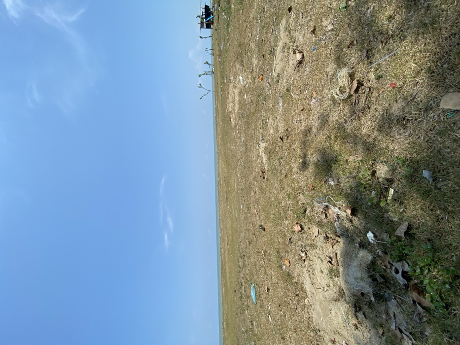 The image displays a wide coastal expanse in Tanjongkapai, Indonesia, under a clear, bright blue sky containing minimal scattered white clouds. A distinct horizon line separates the sky from a calm, greenish-blue sea. The foreground and midground consist of an open area primarily covered with dry, yellowish-brown grass and sandy patches, interspersed with some greener vegetation. Distributed across this ground are various items of refuse, including a blue plastic bag, white plastic remnants, tangled white string or netting, and dried leaves. To the far right, near the horizon, an elevated wooden structure with a dark roof is visible, featuring a blue tarp-like material on one side. Adjacent to this structure, a blue slide is present. Several slender, partially bare saplings or small trees stand near the structure. No human figures or active interactions are observable.