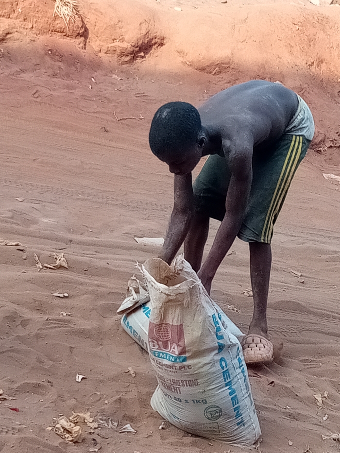 A young male is depicted bent over in a reddish-brown sandy outdoor environment in the city of Unknown, Unknown. He is shirtless, clad in dark green shorts with three yellow vertical stripes on the sides, and wearing light-colored slip-on sandals. His exposed skin is coated with a light-colored dust. His hands are positioned inside the open top of an upright white cement bag, which displays "BUA CEMENT PLC" branding, a globe logo, and "50 ± 1KG." A second, similar cement bag lies horizontally behind the first. The sandy ground shows indentations, possibly tire tracks, and scattered light-colored debris. A raised earth bank with sparse, dried vegetation forms the background. The scene is illuminated by natural daylight.