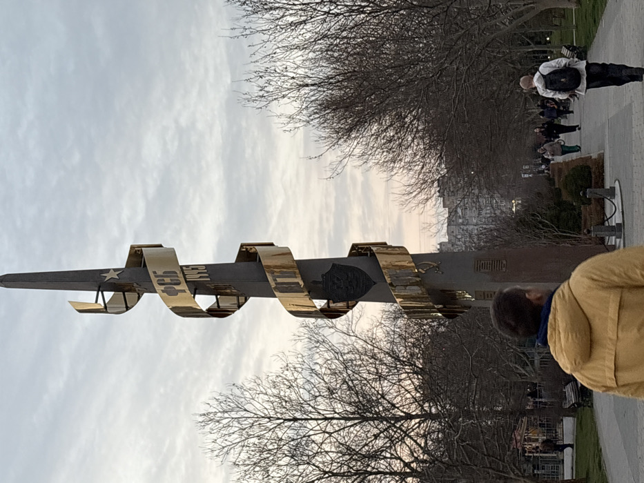 The image depicts the Monument to the Chekists in Krasnodar, Russia, located within a public park or boulevard setting, likely near the intersection of Krasnaya and Gorky streets. The central subject is a tall, dark grey obelisk monument. A golden, spiraling ribbon is wrapped around the obelisk. Visible inscriptions on the golden ribbon include the Cyrillic letters "ФСБ" (FSB) at the top, followed by the date "1945", and further down, "1917". A dark emblem, resembling the coat of arms of the Federal Security Service, is affixed to the obelisk below the spiraling ribbon. A star is present near the obelisk's apex. In the foreground, a male subject is positioned with his back to the camera, wearing a yellow jacket over a blue garment, walking towards the monument from the lower left. To the right of the monument, on a paved pedestrian path, another male subject, wearing a light-colored jacket and a dark backpack, walks away from the camera. Further along this path, three additional individuals (two females and one male) are walking towards the camera. Multiple other indistinct figures are visible in the background along the path and amidst the trees. The environment consists of numerous bare deciduous trees lining the paths and surrounding the monument, indicating a cold season. Park benches are visible along the paved walkway. The sky is overcast with light grey clouds. Multi-story urban buildings are discernible in the far background, behind the trees. The ground comprises paved pathways and grassy areas.