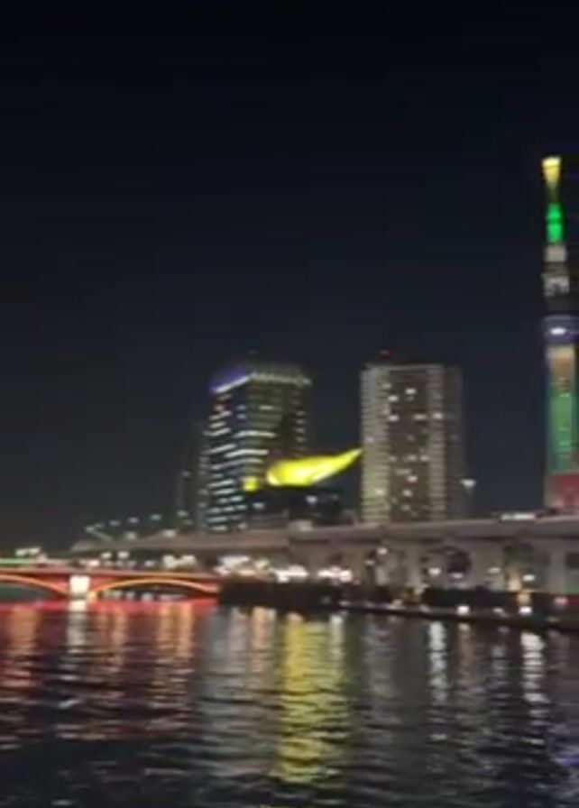 nighttime cityscape with a river in the foreground. The water reflects the lights from buildings and a bridge. The bridge is illuminated with red and orange lights. In the background, there is a tall tower with green and white lights at the top, and buildings illuminated with blue and yellow lights.