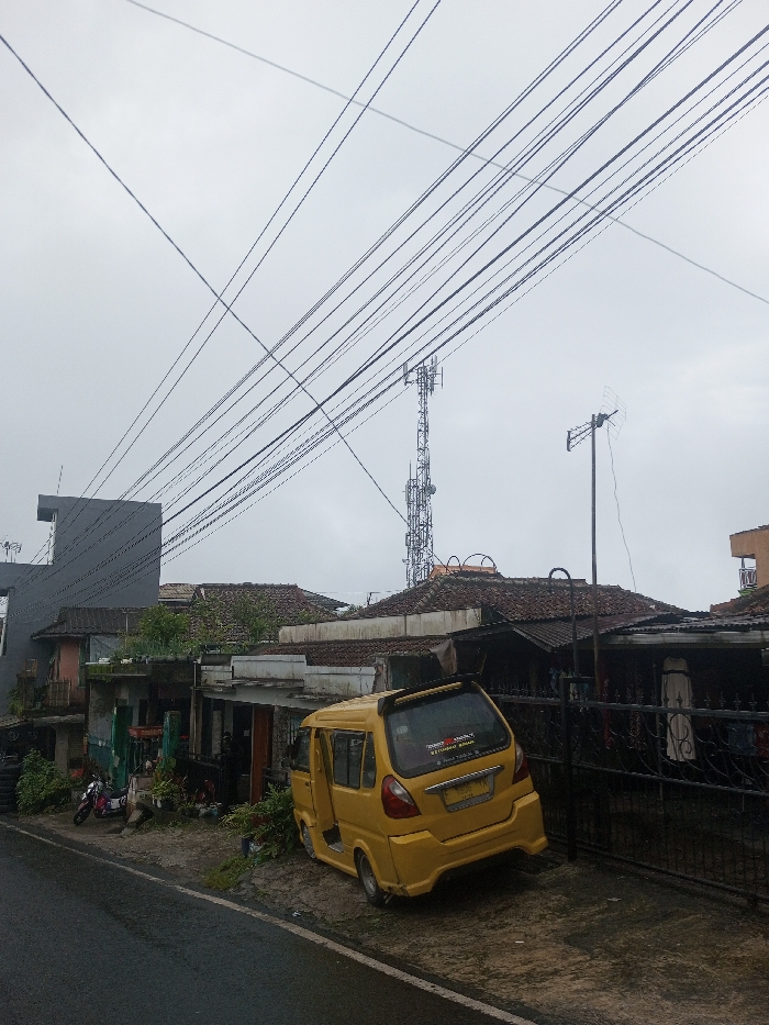 An overhead view depicts a residential street in Babaliya Mal., India, under an overcast sky. A wet asphalt road occupies the lower left. A yellow, three-wheeled vehicle, with its front passenger door open, is parked off the road on a dirt shoulder to the right. Its rear license plate displays "7087 HK" and multiple stickers adorn the rear window. Further left, a red and white motorcycle is parked near a multi-story building with dark grey walls. A row of buildings with reddish-brown tiled roofs extends across the mid-ground. Numerous black utility wires crisscross the sky. In the background, a tall metal telecommunication tower stands prominently, and a Yagi antenna is mounted on a pole above the rooftops to the right. Scattered vegetation is visible near the buildings and along the roadside. No individuals or active interactions are clearly discernible within the scene.
