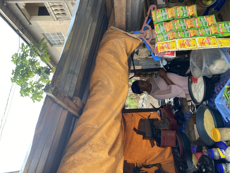 An outdoor market stall in Ihiagwa, Nigeria, features a female vendor engaged in retail activity