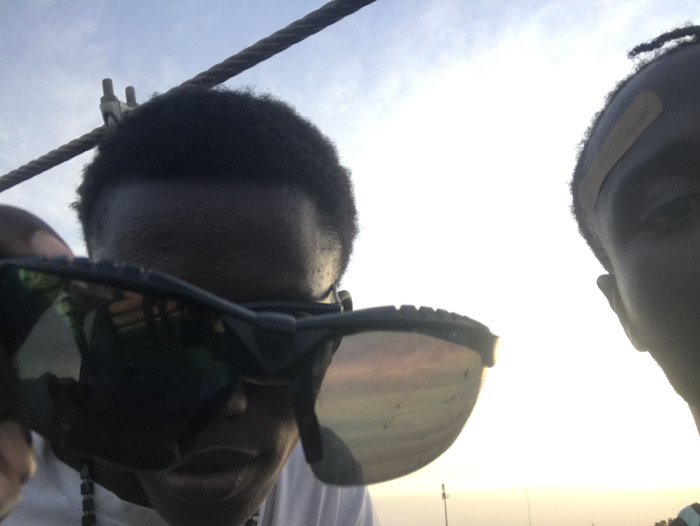 Two young Black men pose for a selfie with a bright, overcast sky as the backdrop. The man on the left holds dark sunglasses in front of his face. He wears a white t-shirt and has close-cropped hair. The second man, partially visible on the right, has a bandage on his forehead. A thick rope runs diagonally in the upper left. The sunglasses reflect the sky and horizon.