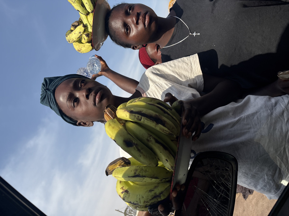 The image portrays a sunlit street scene in Karshi, Nigeria, featuring three individuals, two prominent young females, engaged in vending. In the left foreground, a young female with dark skin wears a teal-colored knotted headwrap and a light-colored t-shirt. She holds a white enamel bowl filled with multiple bunches of green bananas, some exhibiting dark blemishes. Her gaze is directed towards the upper right. Behind her, a hand belonging to a partially obscured individual extends, holding a clear plastic bottle of water. To the right of the first individual, a second young female with dark skin wears a black t-shirt and a silver chain featuring a crucifix pendant. She balances a white enamel bowl filled with similar green bananas on her head. Her gaze is also directed towards the upper right. A third individual, partially visible behind her, wears a red head covering. The photograph is taken from a low angle, likely from inside a vehicle, indicated by a cracked side-view mirror visible in the bottom-left corner of the frame. The background consists predominantly of a clear blue sky with minimal scattered white clouds. Distinct shadows on the subjects suggest direct and intense sunlight.
