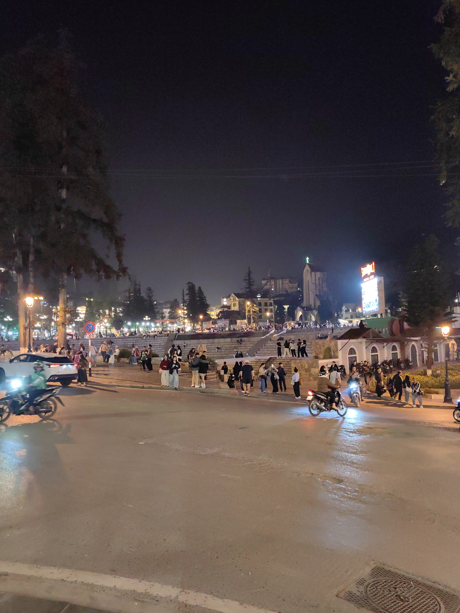 This image displays a night scene in Sa Pa, Vietnam, focusing on a public square in front of Sa Pa Stone Church (Holy Rosary Church). The foreground features an asphalt street exhibiting areas of reflectivity, suggesting moisture or illumination. A white SUV is positioned on the left side of the street, while at least two motorcycles with illuminated headlights are in motion. Pedestrians are present on the sidewalk. In the midground, a significant number of individuals are gathered across a multi-tiered stone plaza and surrounding walkways, with some standing, others in motion, and some observing the scene. Multiple streetlights illuminate these areas, and dark-foliaged trees are interspersed throughout the plaza and along the street. A red circular traffic sign is visible. The background is dominated by the illuminated Sa Pa Stone Church (Holy Rosary Church), identifiable by its stone construction and a prominent green cross atop its steeple, situated on an elevated section. To the right of the church, a tall structure displays a large, brightly lit commercial sign. Additional illuminated buildings are visible on the distant slopes and hillsides, all under a dark night sky.