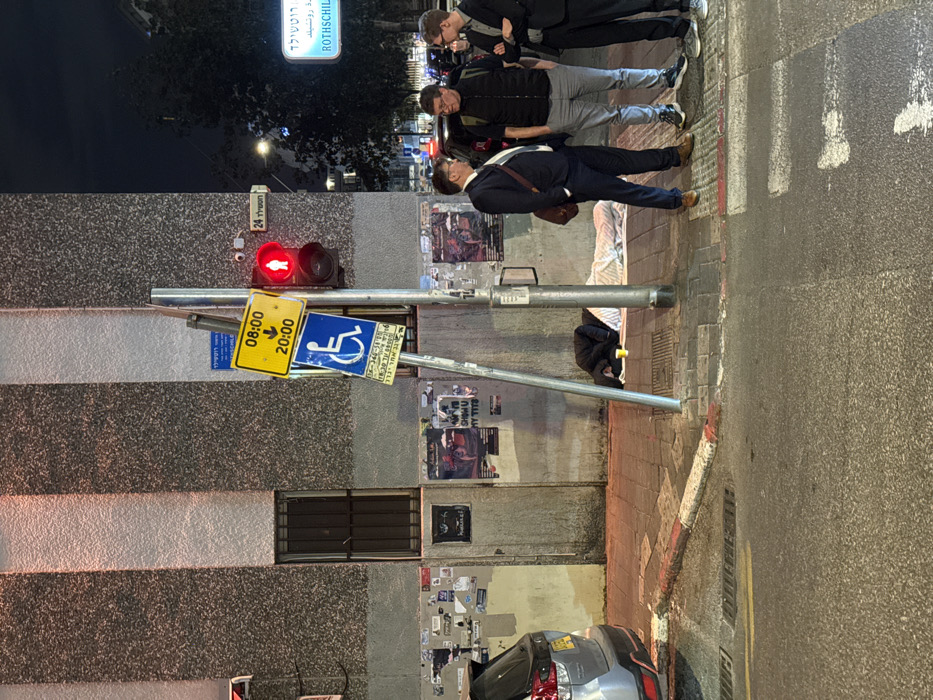 A street scene at night features pedestrians walking along a sidewalk. A traffic light displays a red pedestrian signal. Street signs indicating "Rothschild" and handicap parking (08:00 to 20:00) are visible. Posters are plastered on a wall next to a building with a dark window. A parked car's rear end is partially visible. The ground is paved, showing some wear and tear.