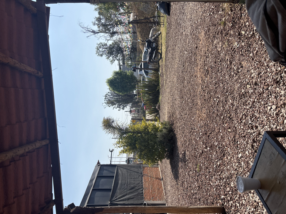 A view from under a rustic roof. Outside, a dirt lot dotted with shrubs leads to a street scene with cars, trees, and decorations. A building partially concealed by black fabric and brick is visible. A motorcycle is parked on the far side of the dirt lot. A cup sits on a table in the foreground.