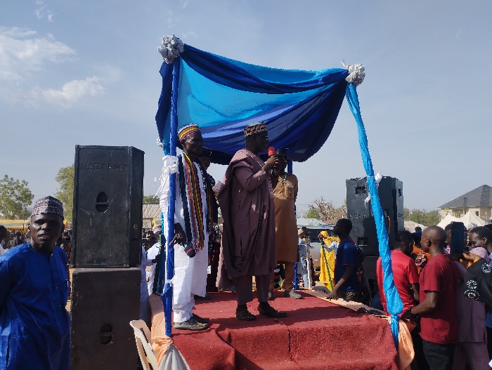 The scene takes place in the city of Chum, Nigeria, specifically at the coordinates 9.707 latitude and 11.713 longitude. A man wearing a brown robe and a traditional hat is speaking into a microphone, standing on a stage draped with a blue fabric canopy. To his left, a man in a white robe and a traditional hat is holding a microphone and looking at the speaker. Behind the speaker, a man in a brown robe and a traditional hat is partially obscured by the blue fabric canopy. The speaker is addressing a crowd gathered around the stage. Two large black speakers are positioned on each side of the stage. Several people are in the background, their faces are obscured by the distance. The stage is a red platform that rests on a grassy surface. There are many trees in the background. The sky is bright blue and clear. The location is likely an outdoor event space with a large crowd attending. The event appears to be a public gathering, perhaps a political rally or a cultural festival.