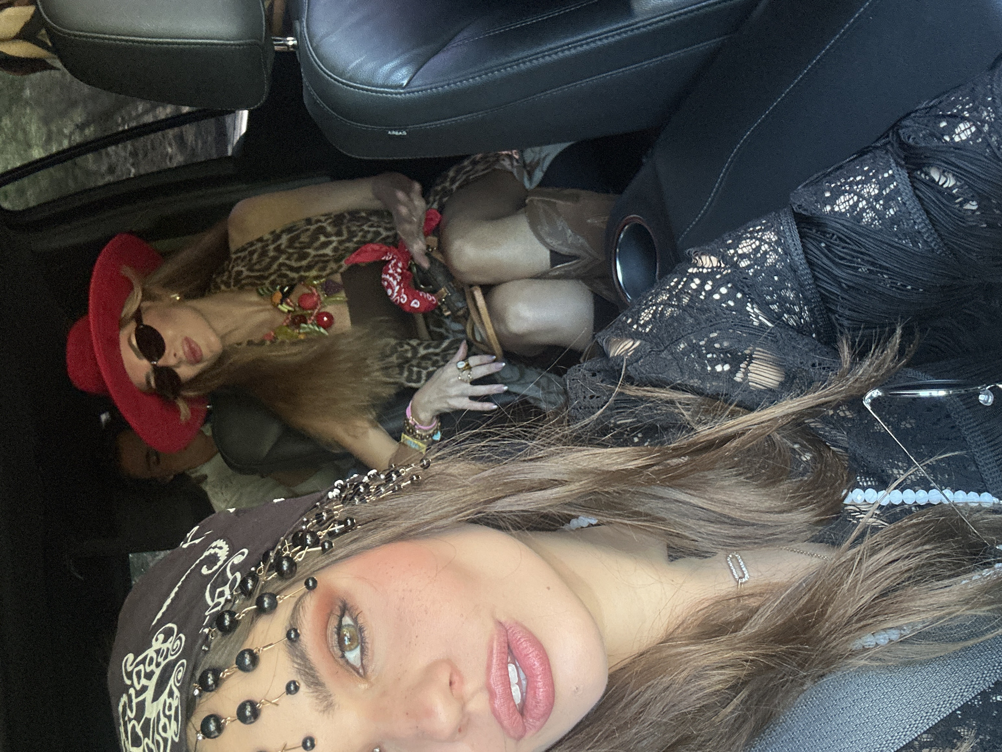 Captured in a vehicle in Rancho Mirage, United States, the image presents two women. The foreground woman is captured in a close-up selfie, wearing a brown paisley bandana adorned with hanging black beads. She features light-colored eyes, rosy cheeks, and full pink lips. Strands of her brown hair frame her face, and a delicate necklace graces her neck. The background woman, farther away, is reclining, sporting a red hat, a leopard-print top, and round sunglasses. She wears several bracelets and holds a brown purse. The vehicle's black leather seats surround the women. Her outfit includes brown cowboy boots.