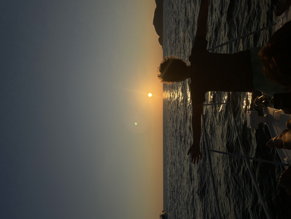 A serene image captures a sunset at sea. The sun's golden disc sits on the horizon, casting a shimmering reflection on the water. A silhouetted figure stands on a boat, arms outstretched toward the setting sun. The boat's railing and other indistinct figures are also silhouetted. A dark land mass is visible in the distance. The sky graduates from a deep blue to a warm orange near the horizon.