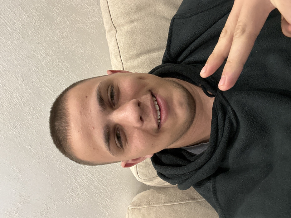 A head-and-shoulders indoor selfie depicts a light-skinned young adult male with short, buzz-cut brown hair
