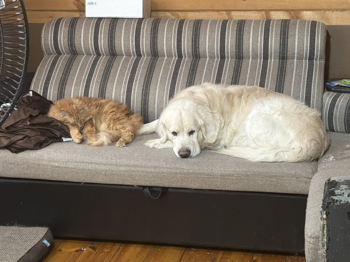 - "An orange cat and a white dog are curled up on a striped couch" by FM-BcGYc2, licensed under CC BY 4.0