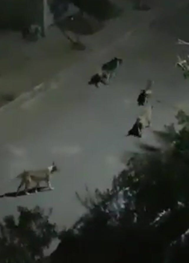 pack of dogs running down a street at night. The dogs are silhouetted against the streetlight. They appear to be scavenging or moving from place to place. The surrounding area is residential, with houses and trees visible. The video is shot from an elevated position, likely from a balcony or window. The scene is dark, with limited visibility.