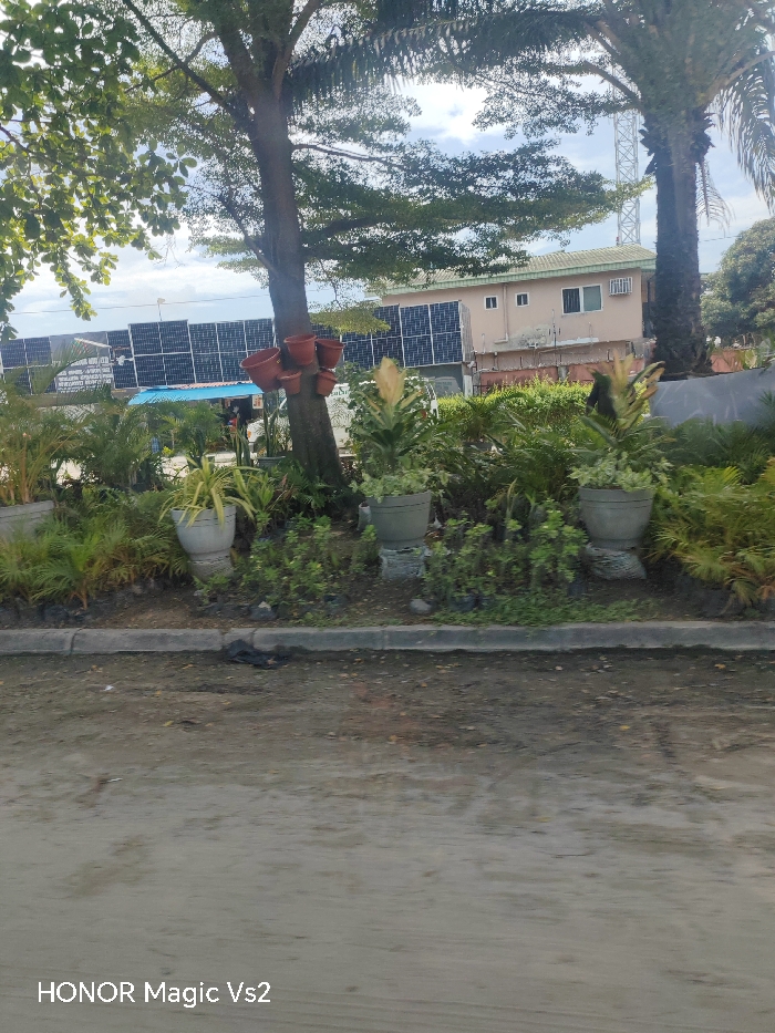 The image displays a street-level view in Festac Town, Nigeria, featuring a landscaped median separating an unpaved road from various structures and infrastructure. The immediate foreground shows a light brown dirt road with some visible tire tracks and debris, bordered by a low concrete curb. Beyond the curb, a landscaped strip contains a variety of green plants and shrubs. Several larger plants with variegated green and light-colored foliage are arranged in prominent gray, urn-shaped pots, resting on cylindrical bases. Smaller plants in black nursery bags are scattered on the ground within this strip. A central tree trunk, likely deciduous, has five reddish-brown terracotta-style pots affixed to its side. To the right, a tall palm tree stands with dark fronds. In the midground, behind the landscaping, a significant array of dark blue photovoltaic solar panels is mounted on a long structure, spanning a substantial portion of the frame to the left. Below a section of these solar panels, a blue fabric awning or tarp is visible, beneath which indistinct figures are present, suggesting human activity, possibly at a small business or stall. A white vehicle is partially visible behind the awning. Further to the right and behind the solar array, a two-story building with a light beige or tan facade and a dark roof is visible. This building features multiple rectangular windows, some with white frames and others with darker frames, and an air conditioning unit is installed on the upper floor. In the far background, behind the palm tree, a tall, slender lattice-style communication tower is faintly visible against the partly cloudy sky.