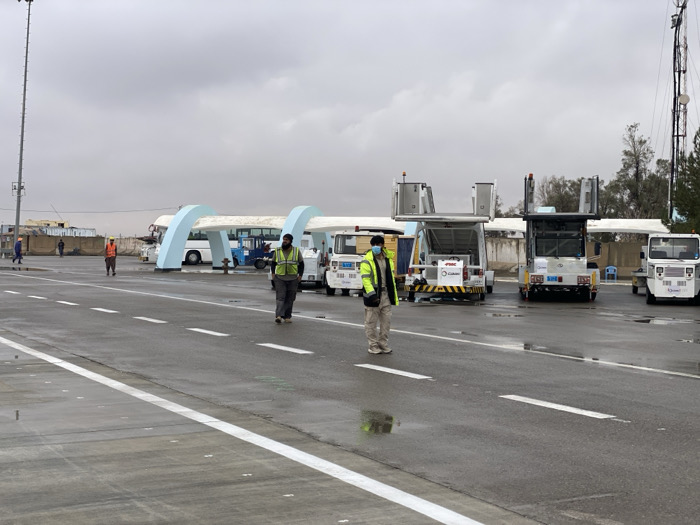 This image depicts an outdoor airport tarmac or ground service area under a heavily overcast sky, with the asphalt pavement visibly wet from recent rain. White painted lines, both solid and dashed, delineate lanes and parking zones. In the mid-ground, three male individuals are present on the tarmac. One, positioned towards the right, wears a beige uniform, a prominent reflective yellow-green safety vest, and a light blue surgical mask, facing slightly left. Another individual, wearing dark clothing and a similar yellow-green reflective vest, walks towards the viewer in the center. A third individual, dressed in dark clothing with an orange reflective safety vest, walks away from the camera on the left side of the frame. Two additional figures in blue uniforms are visible near a tall light pole in the far-left background. Several pieces of airport ground support equipment are parked on the right side of the tarmac. These include two white mobile passenger stair units with their platforms raised, one prominently displaying 'FMC' and 'Cavotec' logos. To their right, a white airport tug vehicle is parked. In the mid-ground left, a blue airport tug vehicle and a white passenger bus are positioned near a light blue arched structure, which appears to be a canopy or entrance. The background consists of low-rise, possibly industrial or maintenance buildings on the far left. On the far right, a tall communications tower with multiple antennas rises, surrounded by sparse, bare vegetation. The overall scene suggests an active but currently quiet airport environment on a damp day, located at an airport within the city of Unknown, Afghanistan.
