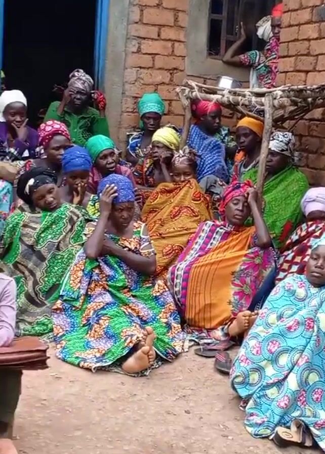 The video depicts a group of people gathered outside a brick building. The majority of the women in the foreground are seated on the ground, draped in colorful fabrics and headscarves. A few men are seated on small stools in front of the group. One man standing in front of them is holding a book and appears to be speaking to the crowd. Behind the seated group, a larger crowd of people stand on an incline. The environment suggests a rural setting, with the brick building possibly being a simple dwelling. The people seem to be engaged in a gathering or meeting of some kind.