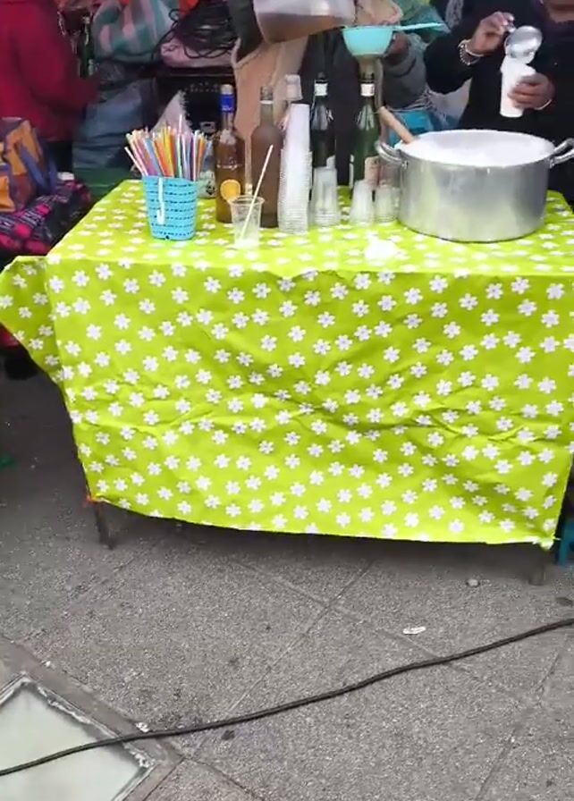 street vendor station in what appears to be a public space. A person with a red hat pours liquid from a clear pitcher through a funnel into a bottle. There are several bottles, cups, straws, and a large pot on a table covered with a bright green tablecloth decorated with white flowers. Other people are present, with one woman using a small scoop and another person wearing a red jacket. The ground is paved with light grey tiles. A black cable runs along the ground. An orange tent-like structure is visible in the background.