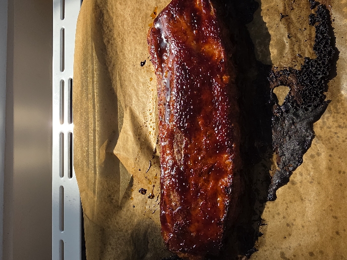 - "A cooked, rectangular piece of meat, coated in a thick, glossy, dark reddish-brown glaze, is positioned centrally on a crumpled sheet of light brown parchment paper" by FM-rp3GD2, licensed under CC BY 4.0