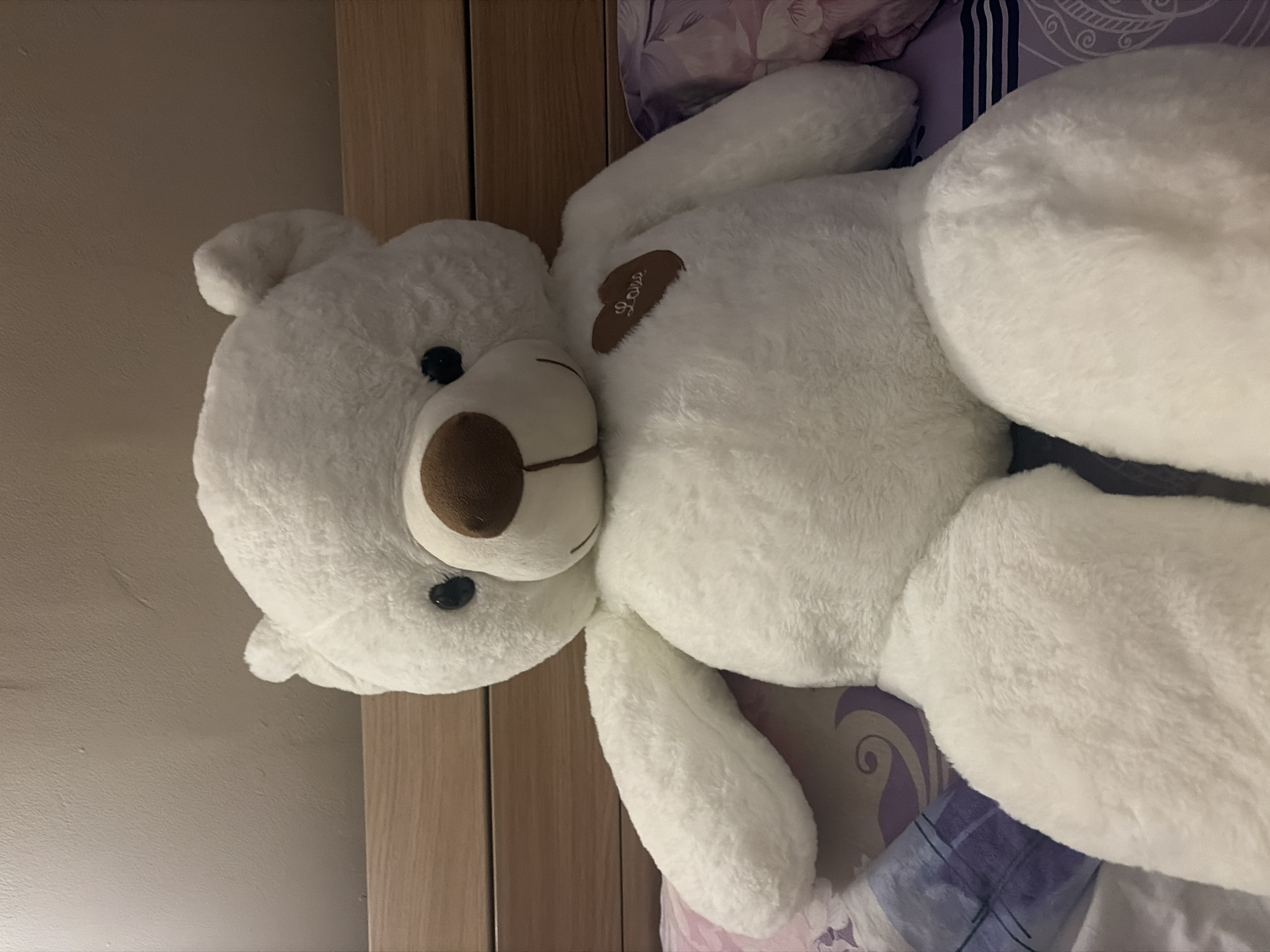 A large, white, plush teddy bear with a brown nose and eyes is lying on a bed with patterned purple and white bedding. The bear has a heart-shaped patch with the word "Love" on its chest. The bear is positioned between a light brown wooden headboard or wall panel and the bedding. No people are visible in the frame. The location is not discernible as being in Sofia, Bulgaria, or any other specific location.
