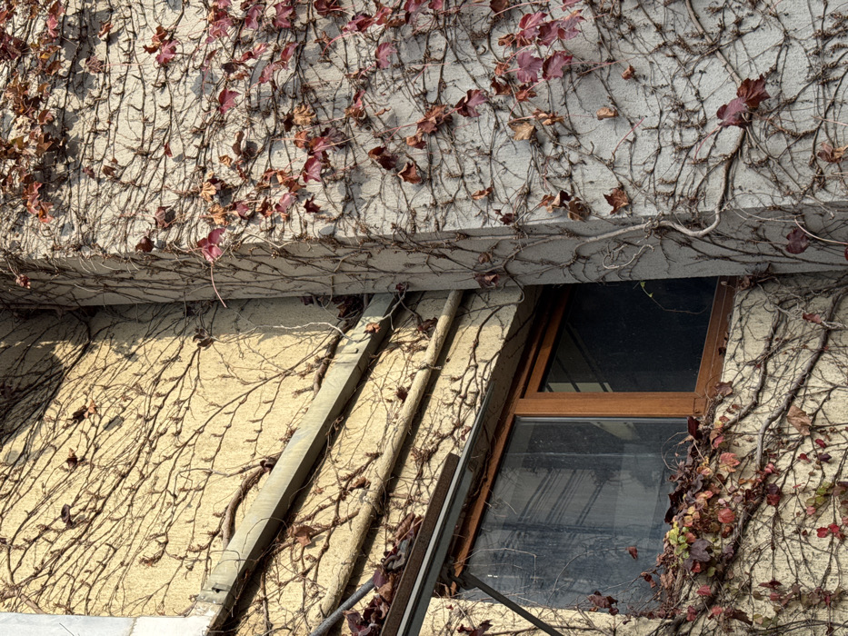 The image displays a section of a building facade in Tbilisi, Georgia, primarily featuring two exterior walls covered in dormant vines. The left wall is a light yellowish-tan stucco or painted surface with several horizontal, slightly protruding bands. A rectangular window with a brown wooden frame is set into this wall; its glass is somewhat reflective and appears dirty, obscuring the interior. Above the window, a horizontal metal rail or track is visible, partially obscured by some dried leaves. The right wall, meeting the left wall at an exterior corner, is a textured grey concrete or plaster surface. Both wall sections are extensively covered with a dense network of bare, woody vine stems and tendrils that cling to the surfaces. Numerous dried leaves, predominantly reddish-brown with some scattered yellow and green, are present on the vines, especially concentrated on the grey wall and along the ledge above the window. Direct sunlight illuminates the scene, casting distinct shadows from the vines and architectural elements onto the wall surfaces. No people or active interactions are visible.