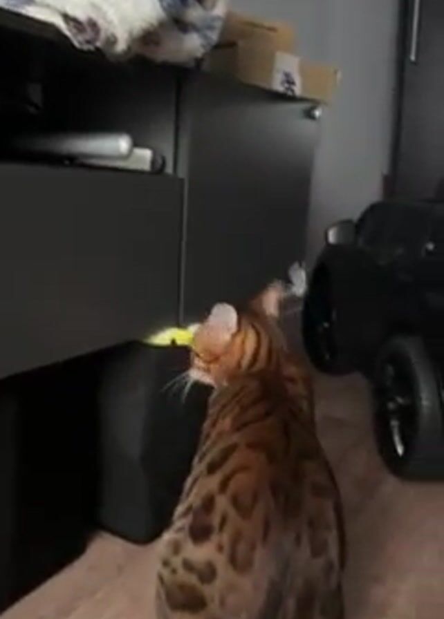 Here's a brief description of the video: A Bengal cat stands on a wooden floor next to a black TV stand and a black toy car