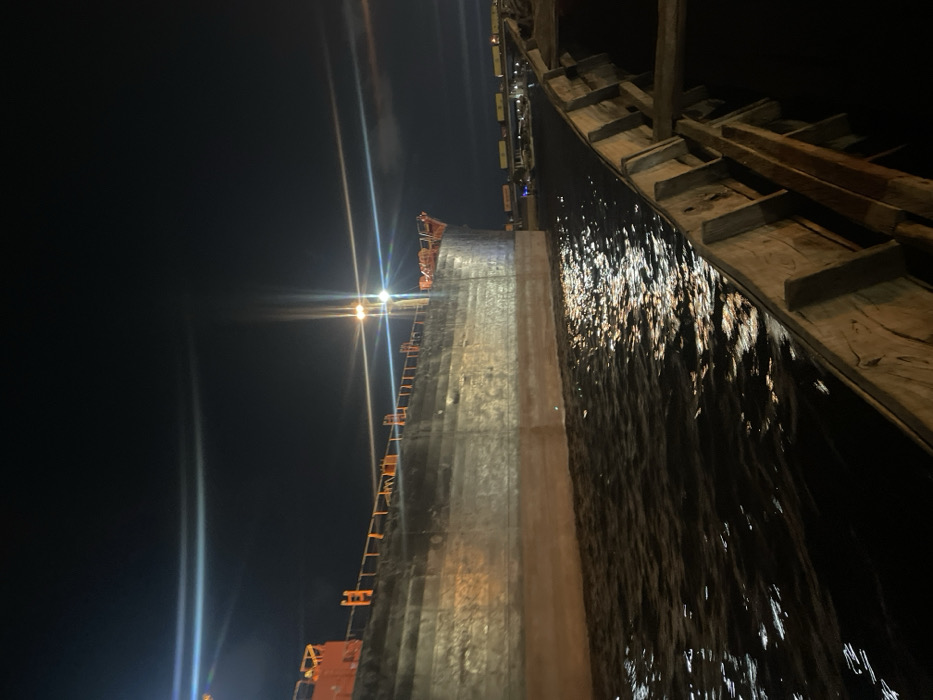 At night, a tall, dark structure dominates the frame. The structure's smooth, central section is illuminated by a bright light, revealing a long ladder attached to its side. To the right, a rough, wooden structure with stepped elements reflects shimmering light. The scene is shrouded in darkness, with a few faint light streaks extending from the light source.