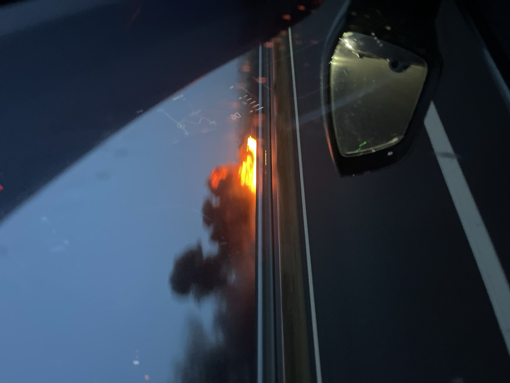 The image depicts an outdoor scene at apparent dusk or dawn, reportedly in the city of Zheleznik, Bulgaria, viewed from the interior of a moving vehicle. A significant fire is actively burning on the left side of a paved road, beyond a multi-layered metal guardrail system. Intense orange and yellow flames are visible, emanating a large, dense plume of dark grey to black smoke that rises and obscures the background. The road surface in the foreground and midground features white lane markings. The vehicle's dark interior structure is visible on the right side of the frame, with its right-side mirror positioned in the lower right, reflecting blurred light. No individuals are discernible within the scene.