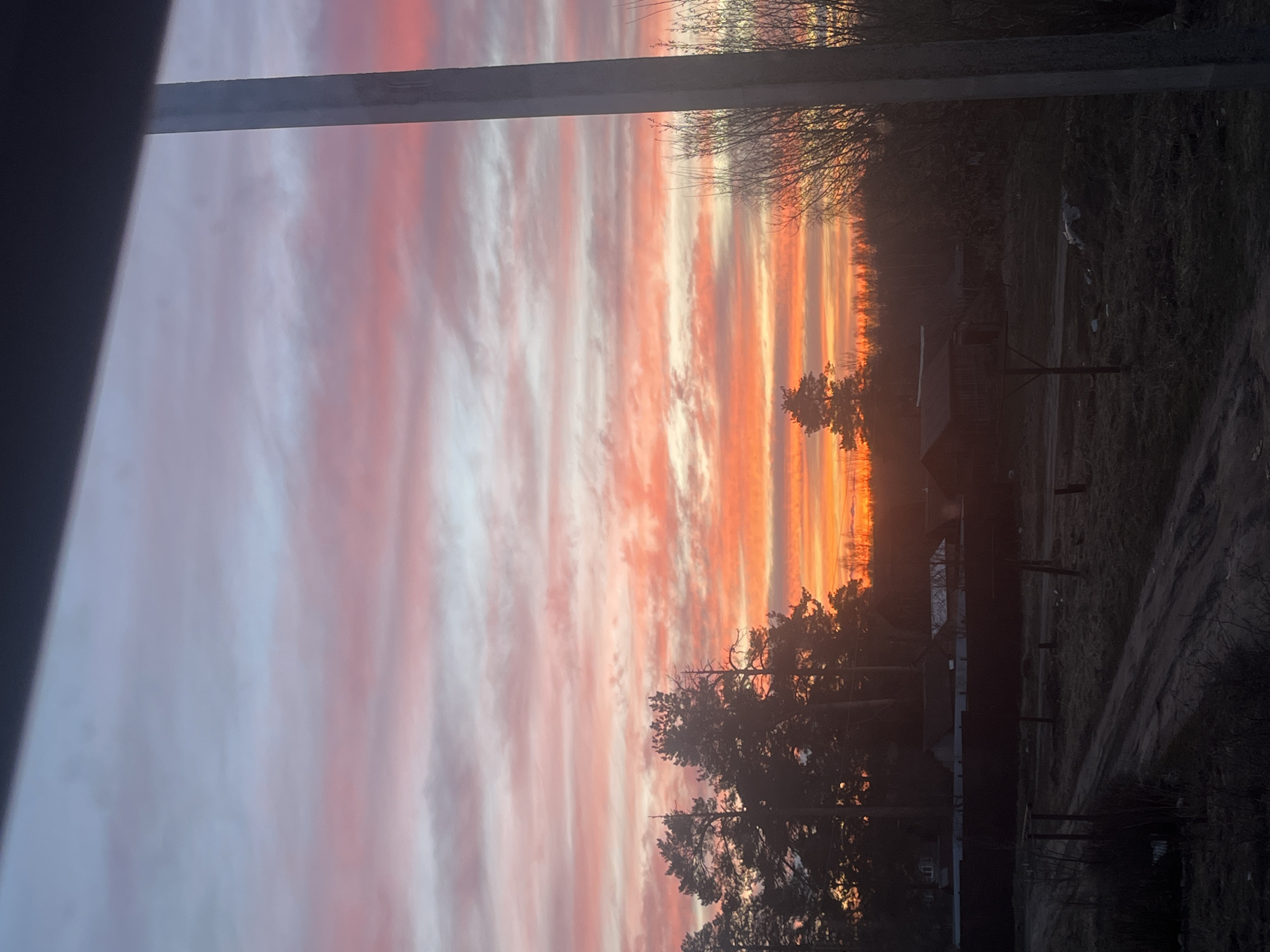 The image depicts a vibrant sunset over the location of Раздолье, Russia. The sky is streaked with horizontal bands of pink, orange, and white clouds, suggesting a low sun angle. Silhouetted against the bright sky are trees, and structures resembling houses. A dirt road or path is visible in the foreground, along with some vegetation. A pole or beam is present in the upper left corner of the image, possibly a window frame or structural element.