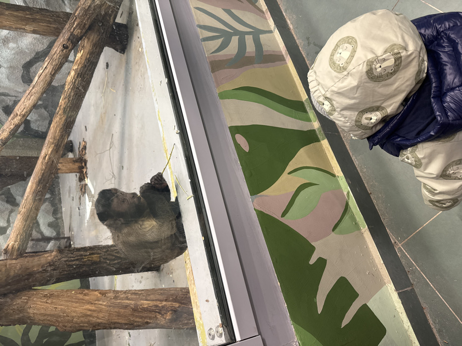 The image depicts an indoor zoo exhibit at the Perm Zoo, Perm, Russia. A single capuchin monkey, characterized by brown fur and a darker head, is observed through a clear glass barrier. The monkey is seated on a light grey concrete floor, actively manipulating a slender, pale-colored twig with both forelimbs. The enclosure background includes multiple rough-hewn timber logs and a textured light grey wall simulating rock. In the foreground, an individual, viewed from behind, is positioned in front of the glass, observing the primate. The individual wears a navy blue padded jacket underneath a light-colored hooded garment featuring a repetitive pattern of stylized lion faces; the hood is raised. The lower section of the glass barrier is secured by a light-colored frame. Below this frame, a wall is painted with an abstract botanical design in shades of green, beige, and light purple. The floor in the observation area consists of dark, possibly green-grey, square tiles.