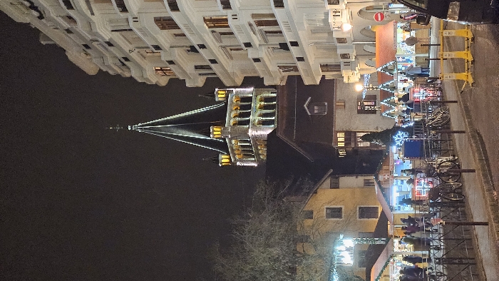 A night cityscape features a towering church spire lit with golden lights, piercing a dark sky. Adjacent, a grand white building with rows of arched windows dominates the scene. Below, a vibrant street lined with Christmas lights and market stalls is visible. Bicycles are parked along the sidewalk. The overall atmosphere suggests a European town during the holiday season, contrasting the historical architecture with festive modern elements.