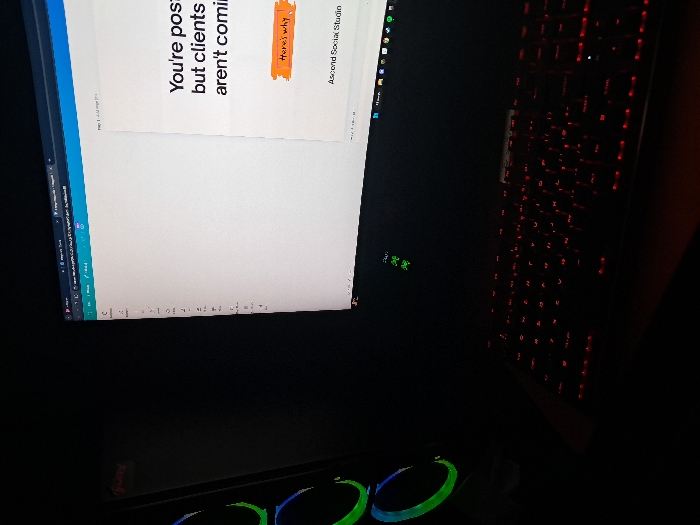 The scene, an interior view within the city of Dragichevo, Bulgaria, displays a dark room illuminated by computer equipment. On the left, a black personal computer tower is partially visible, featuring three circular fans emitting green and blue LED light. A computer monitor occupies the central-right portion of the frame, displaying a white web application interface identified as Canva. The screen exhibits black text partially visible as "You're posi but clients aren't comin", an orange button labeled "Here's why", and "Ascend Social Studio" at the bottom right of the displayed content. A black keyboard with red key backlighting is positioned on a flat surface in the immediate foreground, beneath the monitor. No human subjects are present in the image.