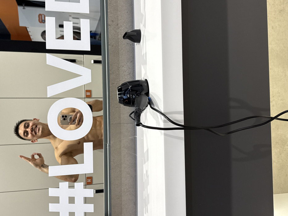 An individual is depicted taking a mirror selfie in what appears to be a locker room or changing area of a fitness center. The specific location is an X-Fit fitness center in Kazan, Russia, identifiable by the visible "LOVE" branding on the mirror, common to the X-Fit chain, and the design of the lockers. The primary subject is a shirtless male, of Asian ethnicity, with short, dark hair and a smiling expression. He exhibits a muscular physique, including visible abdominal muscles. His left arm is raised, forming an "OK" gesture with his hand, while his right hand holds a smartphone, likely an iPhone, which is positioned to capture his reflection. The phone features a MagSafe-compatible accessory on its back. A tattoo is visible on his left forearm. He is wearing white bottoms, possibly underwear or swim shorts. A faint, partial reflection of another individual in dark attire is discernible on the far right of the mirror. The background consists of a reflective mirror surface featuring large white, capitalized letters spelling "#LOVE". Behind the reflection are white lockers with orange numbered tags, one showing "8T". Below the mirror, a white countertop extends across the frame. On this countertop, a small, black, compact hairdryer is positioned, plugged in with its black electrical cord draped downward. A separate black nozzle attachment for the hairdryer rests on the countertop to the right. The lower portion of the image shows a dark gray panel beneath the countertop, and a light-colored floor.