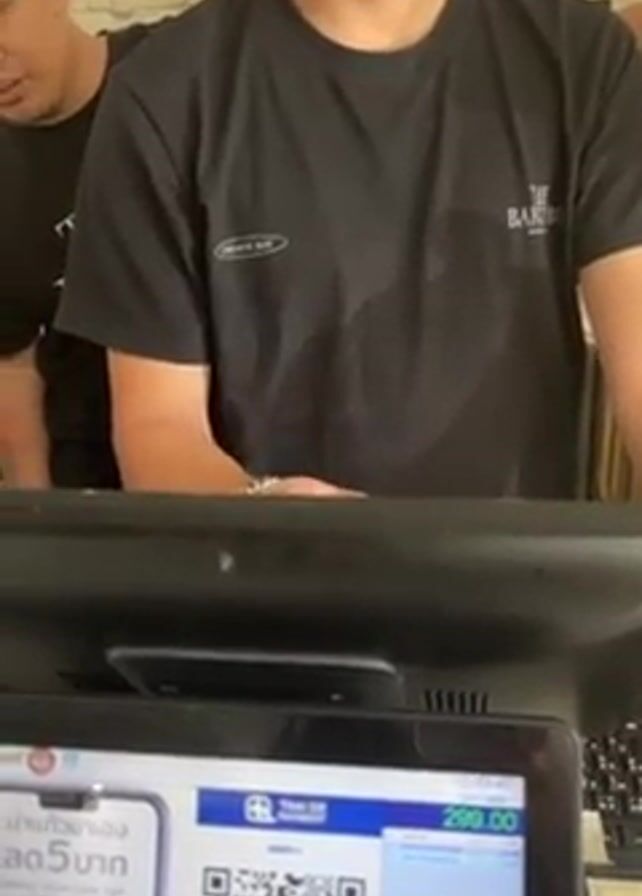 Two young men in black t-shirts stand behind a black point-of-sale system with a digital display that shows a Thai QR code and a total of 299 baht. They appear to be working in a cafe. Behind them, a white and chrome coffee machine is visible, with a row of white mugs stacked on top. The wall behind the machine is white with the words “THE BARISTA” in large letters. One of the men interacts with the point-of-sale system, while the other looks on. Another person can be seen in the background.