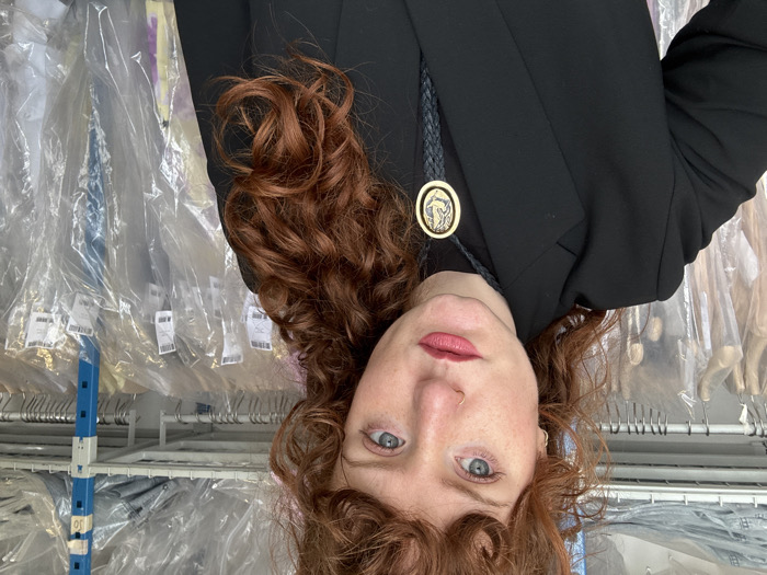 A woman with red, curly hair and light blue eyes looks directly forward. She has fair skin with freckles and wears light red lipstick, a small nose piercing in her left nostril, and a small hoop earring in her left ear. She is dressed in a black blazer over a dark top, accessorized with a black braided bolo tie featuring a gold-toned oval pendant with an embossed, stylized design, possibly a bird. The background consists of an indoor storage area, likely a backroom or garment facility located in Paris, France. Numerous garments are visible, hanging on metal racks and predominantly covered in clear plastic bags, some with visible white labels. A blue metal shelf support is partially visible on the right, with items stored on top, also encased in plastic.