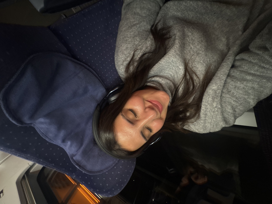 A woman with long, dark hair wearing a gray sweater and black headphones rests her head on a blue, patterned headrest of a train seat