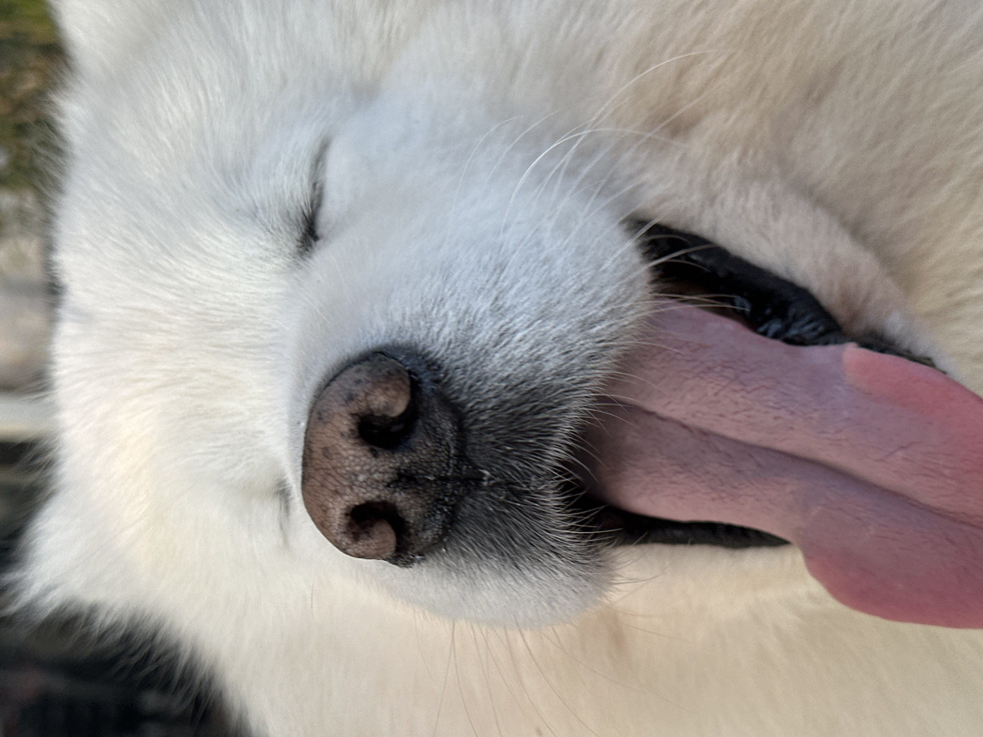 Close-up of a white dog's face. The dog has its eyes closed and its tongue is sticking out. The dog's nose is visible and appears to be brown. The background is out of focus and appears to be a mix of green and brown. Location information is not available.
