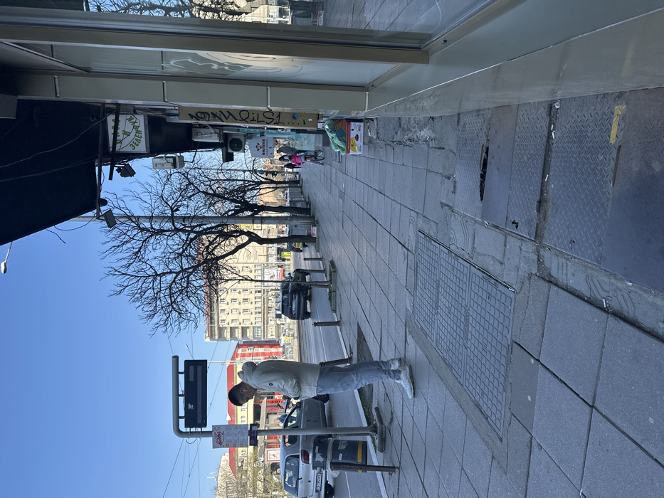 An outdoor urban scene in Sofia, Bulgaria, on a clear, bright day. The image depicts a wide sidewalk alongside a multi-lane road, bordered by commercial and residential buildings. In the mid-ground, a young adult male, wearing a white hooded jacket, light blue jeans, and white sneakers, stands facing left at a bus stop. He is looking down at a smartphone held in both hands and has white earbuds in his ears. Adjacent to him is a grey metal bus stop sign structure with a dark electronic display and a red paper schedule; a dark cylindrical garbage bin is attached to its base. A silver hatchback, bearing Bulgarian license plate C 9369 MX, is stopped or parked in the street behind the man. The sidewalk, paved with grey rectangular concrete slabs, shows signs of wear and disrepair, including cracked sections and uneven surfaces. In the foreground, two metal manhole covers are visible; one features a grid pattern, and another with a diamond plate pattern has a section that appears damaged or partially open, revealing a dark void. Cigarette butts and debris are scattered on the ground near the building facade. On the right, a commercial building features a dark awning extending over the sidewalk. Visible signage includes "ПЛОД И ЗЕЛЕНЧУК" (Fruit and Vegetables) in green Cyrillic lettering and "БЪЛХАРКА" (Bulharka) on a red sign further down. Two security cameras are mounted under the awning, and several air conditioning units are affixed to the building's facade. A cardboard box containing green items rests on the ground near the storefront. Large windows on the building reflect the street and sky. Further down the sidewalk, a child wearing a pink jacket is riding a bicycle, moving away from the viewer. Other indistinct figures are visible walking in the distance. The road in the background carries vehicular traffic, including a dark SUV. Bare deciduous trees line the street, and multi-story buildings with numerous windows form the backdrop.