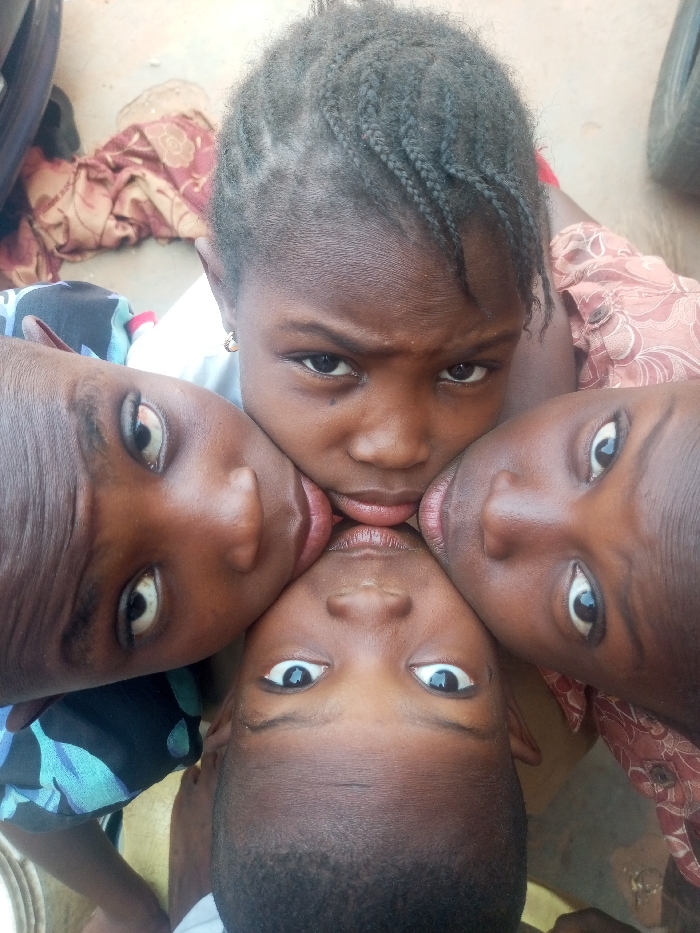 Four young individuals are positioned in a close-up, overhead shot in Tempure, Nigeria