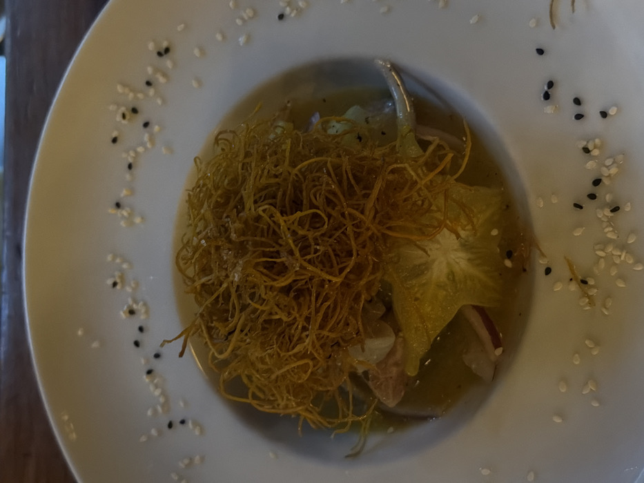 A close-up shot reveals a dish in a white bowl, featuring a star fruit immersed in a clear broth. A pile of fried vermicelli noodles rests atop the star fruit. The plate's rim is garnished with scattered black and white sesame seeds. The overall composition conveys a dish prepared with an emphasis on visual presentation.