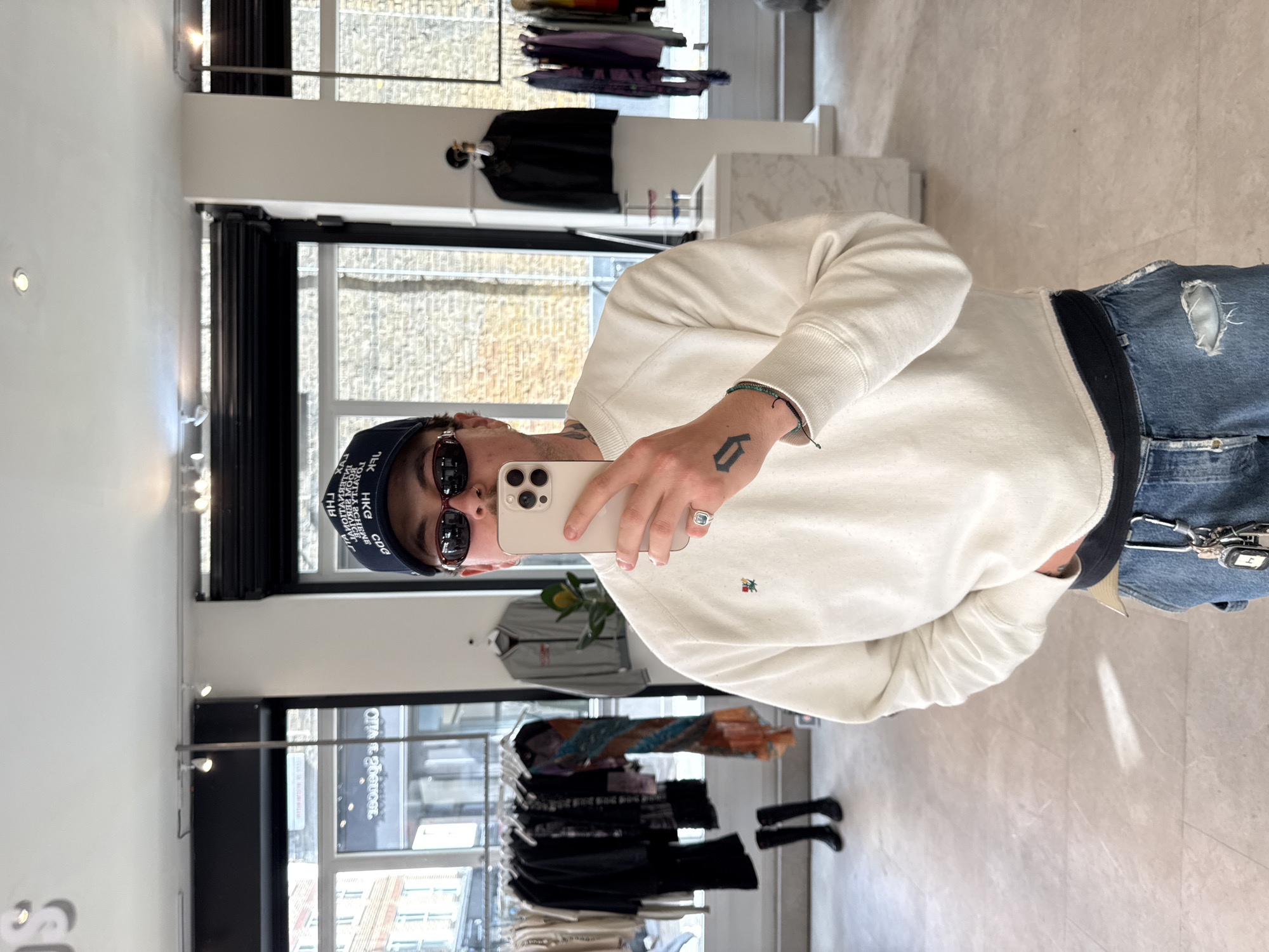 A man wearing sunglasses and a blue cap is taking a selfie with a white smartphone in what appears to be a retail store. He is wearing a light-colored crewneck sweater and ripped blue jeans. The store contains racks of clothing, and the window behind him shows a streetscape. The signage visible through the window reads "Ollie & Nikko", suggesting this store is the Ollie & Nikko location on Chiltern Street, London, United Kingdom.