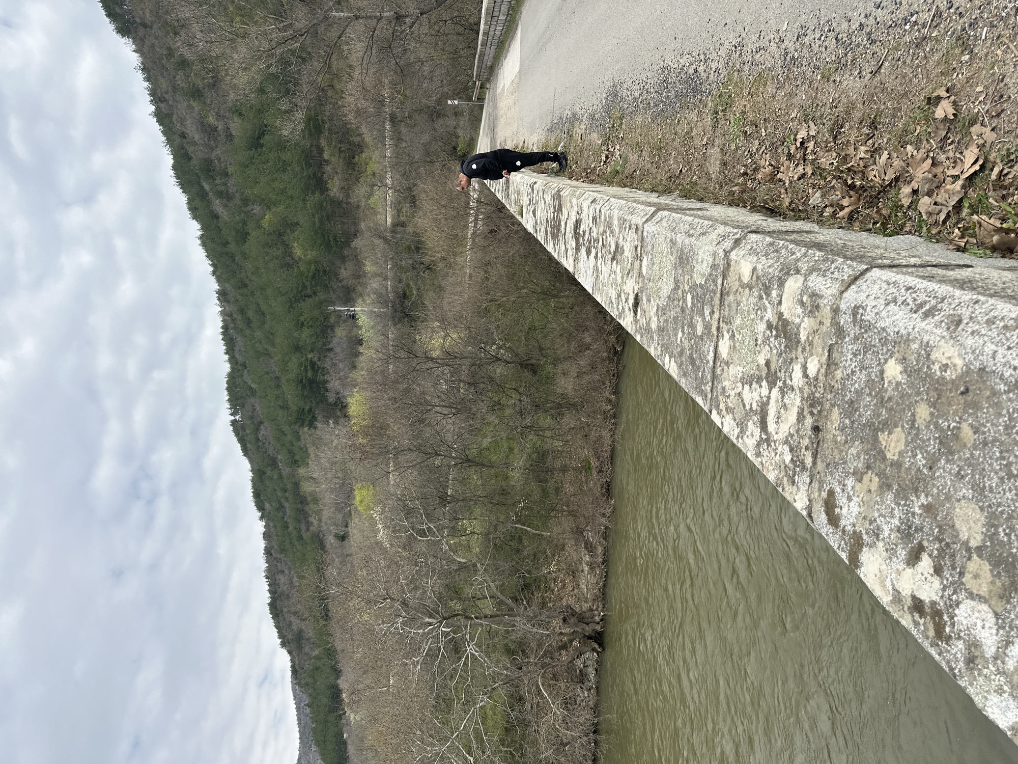 A man wearing a black tracksuit is doing push-ups on the ledge of a bridge. The bridge spans a river, with a forested hillside on the opposite bank. The location is Stara Kresna, Bulgaria.