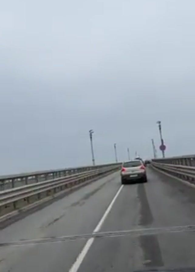 A first-person view from a car driving on a bridge on an overcast day. The car is following other cars with lane markings visible. The bridge has railings and light posts. The camera then shifts to an interior view of the car's dashboard.