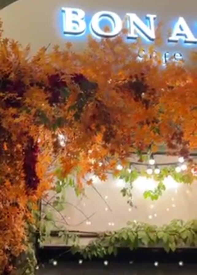 close-up of the front entrance to "BON Cafe" with a white facade. The name "BON Cafe" is written in large, blue, illuminated letters. The entrance is decorated with an arch made of autumn-colored leaves, mostly orange and red, with some green vines. Small white string lights are visible among the leaves. The lighting suggests it is nighttime.