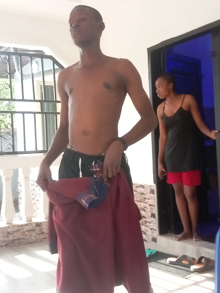 The image depicts two individuals on a residential property in Igbenu, Nigeria. In the foreground, a shirtless young adult male of dark complexion stands facing slightly right. He wears dark shorts with a visible plaid boxer waistband and a dark beaded bracelet on his left wrist. He holds a folded maroon garment with a blue, orange, and brown plaid lining in both hands at waist level. Behind him to his left, a white balustrade is visible, with a window featuring dark metal grilles and external greenery beyond it. The floor beneath him is light-colored tile, and the wall below the balustrade has a textured, multi-toned finish. In the background, to the male's right, a young adult female of dark complexion with braided hair is partially visible standing inside a doorway. She wears a black spaghetti-strap top and red shorts, with her bare feet on the interior floor. She is looking to her left, away from the male subject, with her left hand near the doorframe. The interior of the room behind her is illuminated with a distinct blue light. Outside the doorway, on the tiled floor, two light-brown slide sandals rest on a dark doormat.