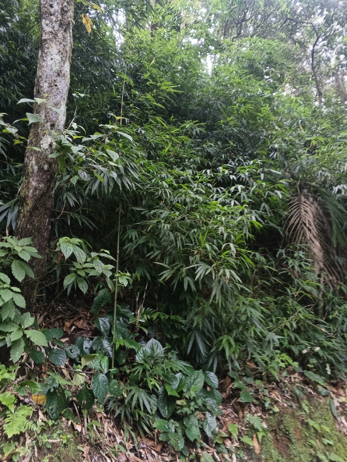 A vibrant green landscape features a thicket of bamboo and lush foliage. A tall, textured tree trunk anchors the scene on the left. Smaller plants with broad leaves cluster at the base, nestled among fallen leaves and mossy patches. In the background, a dense canopy of trees and other vegetation creates a sense of depth and enclosure. A dry palm frond adds a touch of brown contrast.