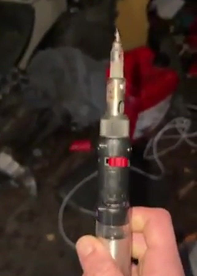 A person is holding a “Hot Pen” soldering iron. The soldering iron has a transparent body with a silver liquid inside. The top is black with a silver tip that is smoking. The person’s hand is visible holding the device. The background is cluttered with various objects. A red gasoline container is partially visible. The environment appears to be indoors.