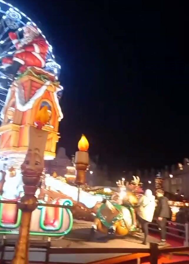 At night, the camera pans across a Christmas market scene. The focus starts on a lit-up carousel ride with Santa Claus on top of a house-like structure. A Ferris wheel glows in the background. As the camera pans, the scene reveals people walking across a red carpet. A large inflatable snowman stands next to a candy cane decoration. The background shows a row of buildings with distinctive gabled roofs. People are milling around, enjoying the market atmosphere.