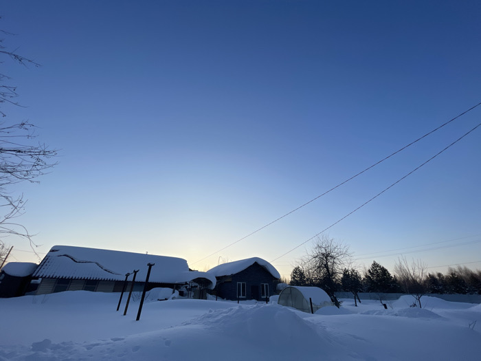 - "The image presents a snow-laden winter scene in Zav'yalovo, Russia, under a clear sky exhibiting a gradient from deep blue to pale yellow at the horizon, suggestive of low sun angle" by FM-NoKcg2, licensed under CC BY 4.0