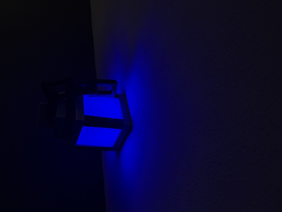 The scene, located in Pavlikeni, Bulgaria, displays a dark, cuboid object resting on a textured, flat surface in a low-light environment. The object emits a vivid blue light from at least two of its vertical faces, illuminating the immediate area around its base with a blue glow that gradually fades into darkness. The upper structure of the object is dark-colored and appears to have a handle or attachment protruding from its right side. The background is uniformly dark and featureless. No individuals, animals, or additional subjects are visible, and no actions or interactions are depicted.