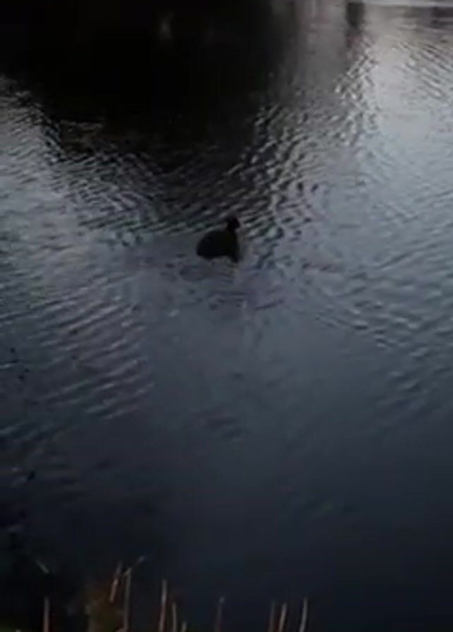 black coot swimming on a body of water. The water is dark, with ripples on the surface, and surrounded by vegetation along the banks. The lighting appears to be dim or at dusk, as the colors are muted.